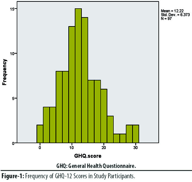 Results: The mean questionnaire score of the 97 respondents in the study was 12.27±6.397. Of them, 19(19.6%) and 11(11.3%) had distress and severe distress respectively. Marital status (p=0.006), age (p=0.029), income per month (p=0.010) and levels of job satisfaction (p=0.001) had significant impact on the scores. Variables having insignificant impact were gender (p=0.529), number of children (p=0.220), education (p=0.816), service years (p=0.155), current employment (p=0.504), nature of job (p=0.531), working hours (p=0.632), additional duties (p=0.663), and socioeconomic class (p=0.935).