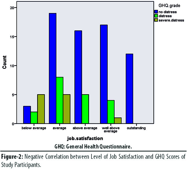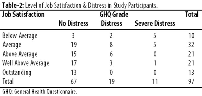 The main outcome variable was distress as per GHQ scores. Independent variables were demographic features and level of job satisfaction.