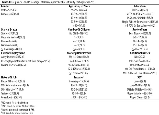 Out of 263 doctors on the hospital roll, 203(77%) initially volunteered, but 97(47.78%) of them filled the GHQ-12 and represented the study sample. Mean age of participants was 33.47±9.454 years (Table-1).