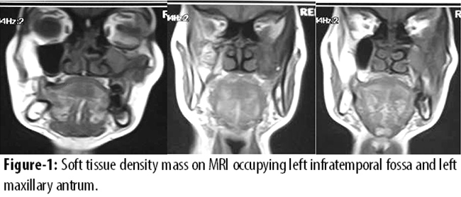 On magnetic resonance imaging (MRI) there was a soft tissue density mass measuring 45×27×31 mmin CC×T×AP dimensions occupying left infratemporal fossa and left maxillary antrum, hypointense on T1, mixed signal intensity on T2 with significant post contrast enhancement. Medially the lesion was limited by the medial wall of maxillary antrum with no extension into nasal cavity. Superiorly it was limited by the floor of orbit. Inferiorly, it extended up to alveolar process of maxilla. Anteriorly it was limited by maxilla. Posterolaterally it was extended into infratemporal fossa involving muscles of mastication. Laterally ramus of mandible appeared intact (Figure-1).