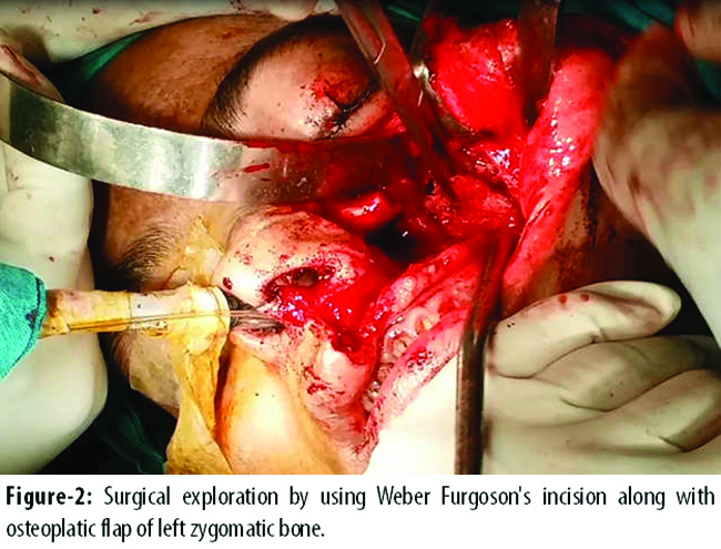 After fiberoptic intubation, surgical exploration was done using Weber Furgoson\\\'s incision with left infraorbital extension along with osteoplatic flap of left zygomatic bone. The lesion was found to be involving of infratemporal space extensively with an erosion of lateral and anterior walls of the maxillary sinus. All muscles of mastication of left side were also fibrosed (Figure-2).