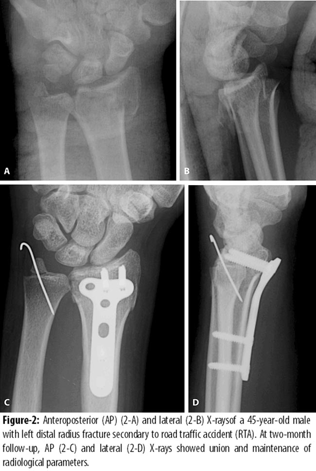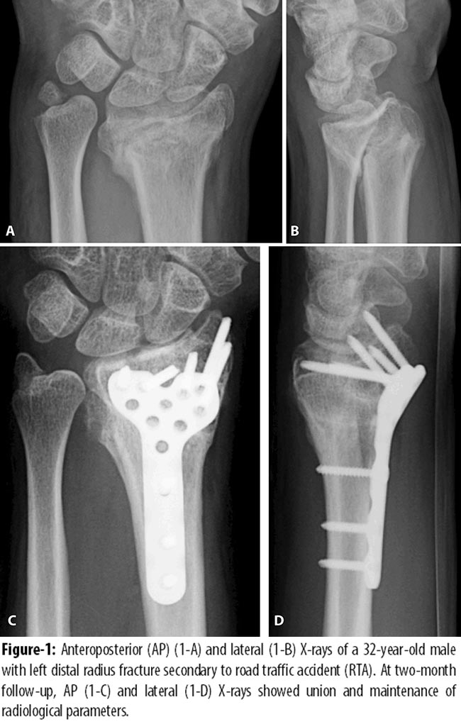 The retrospective study was conducted at Aga Khan University Hospital (AKUH), Karachi, and comprised record of patients from June 2009 to July 2012. All adult patients with closed, intra-articular distalradius fractures with post-reduction articular step of >2 mm; sagittal plane angulation >15° (as measured from the anatomical volar tilted position) were included.8 Skeletally immature patients, as identified by growth plates on X-rays, and those who had neurological illness or other concomitant hand injuries or fractures were excluded. Fractures more than 2 weeks old were also excluded. To eliminate surgeon-related bias, patients in whom bone grafting or bone substitute was used were also excluded from the study.
