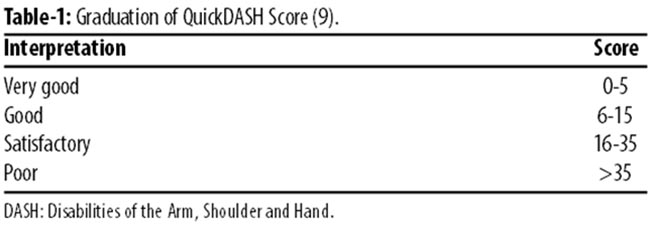 Chinese as well as Synthes locking plates had been used. A standard volar approach through the bed of flexor carpi radialis had been performed in all cases. The patients were followed up by means of case notes, radiographic assessment and functional outcome. Functional outcome was determined with the help of telephone based Quick-DASH (Disabilities of the Arm, Shoulder and Hand) score questionnaire, which was translated in Urdu and administered atleast 6 months post-surgery. Although Quick-DASH score is a very commonly used outcome assessment tool in international orthopaedic literature and it has been translated to different languages but we were not able to get its Urdu version. As most of our patients were more comfortable with Urdu, we used the translated version in all cases. The quick-DASH outcome measure consists of 11self-reported questions designed to measure the ability to perform certain routine activities of upper extremity and it is commonly used to assess pre- and post-intervention difference. In our study, it was impossible to document pre-intervention score because of acute injury, but there have been several studies on similar subject that too have not mentioned pre-intervention scores.7,8 The Quick-DASH score ranges from 0 to 55, with lower numbers indicating a lower level of disability (Table-1).10