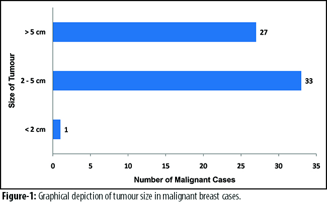 Among the 61 patients with malignant breast lesions, 53(86%) were diagnosed with invasive ductal carcinoma, 5(8%) invasive lobular carcinoma, 1(2%) patient each for medullary, metaplastic carcinoma and invasive cribriform carcinoma. The range of tumour size in malignant breast cases was recorded (Figure-1).