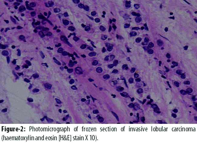 Out of 61 malignant cases, 59(96%) were diagnosed correctly on touch imprint cytology, while 2(4%) were given false negative results. The histology of the false negative cases turned out to be invasive lobular carcinoma (Figure-2)