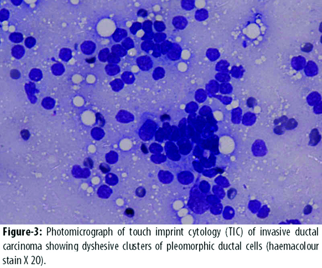 The cross-sectional validation study was conducted at Foundation University Medical College, Islamabad, from February 2011 to February 2012, and comprised patients undergoing mastectomy/lumpectomy. After approval from the institutional ethics committee, mastectomy/ lumpectomy specimens were collected from the operation theatre of Fauji Foundation Hospital, Rawalpindi. Every specimen was serially sliced and the lesion was identified. The most representative part of the lesion was used. Touch imprint cytology slides were made and stained with haemacolour.