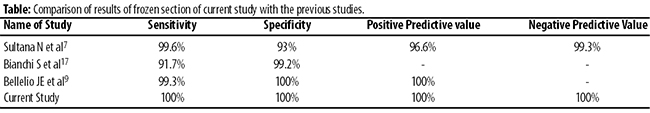 In another study17 frozen sections accurately diagnosed 623 out of 650 cases. The frozen section diagnosis was deferred to paraffin section in 22 cases. In their study 3 false positive and 24 false negative cases were diagnosed. The sensitivity and specificity recorded in their study was lower compared to our study measuring 91.7% and 99.2% respectively.