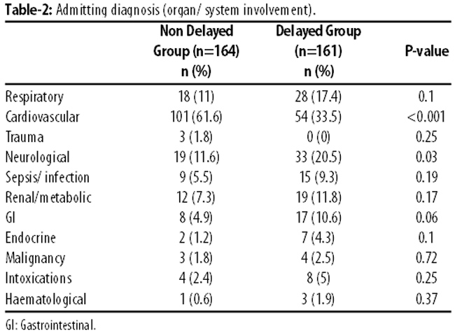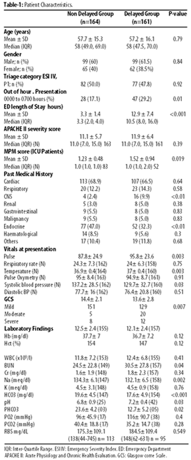 Of the 49,532 patients reporting at the ED during the study period, 17,968 (36.3%) were admitted. Of them, 2356(13%) were admitted to SCU/ICU, and 1595(67.7%) of this sub-group stayed in the ED for >6 hours before being shifted to intensive care. Keeping in view sample size requirements, the study randomly picked 325(0.65%) of the total cases; 164(50.5%) in the non-delayed group and 161(49.5%) in the delayed group.