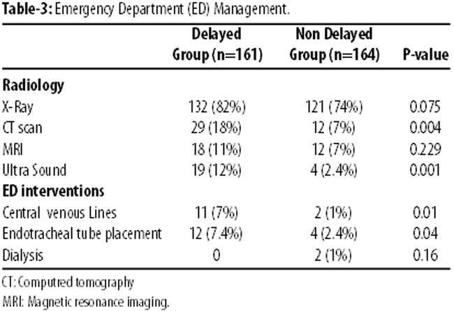 Significant delays were observed in patients with radiological intervention and emergency procedures in the ED (p<0.05) (Table-3).