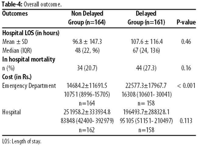 There was no significant difference in the in-hospital LOS between the two groups (p>0.05). However, the ED cost was significantly increased in the delayed group (p<0.05), but there was no difference in the in-hospital cost of both the groups (p>0.05) (Table-4).