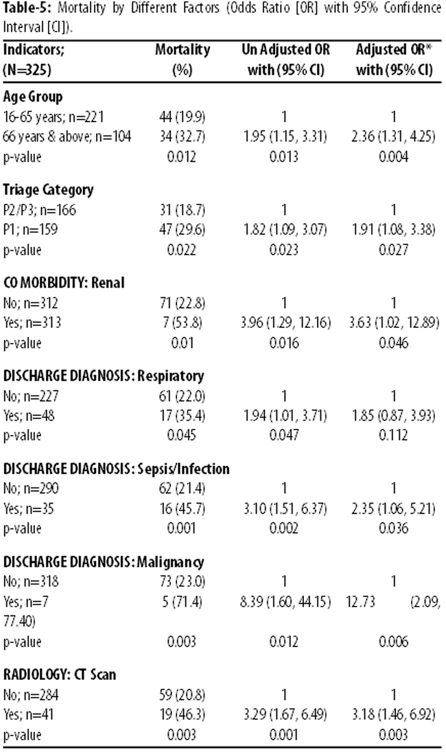 Patients who died in the hospital had higher mean APACHE score 14.04±6.8 compared to those who survived 10.63±5.6 (p<0.001). Mortality was found relatively high 26(33.8%) in delayed patients that were mostly triaged P1 compared to 16(23.5%) in P2 and 2 (12.5%) in P3. Similarly, there was 18 (34%) mortality in age 66 or more compared to 9 (29%) and 17 (22.1%) in 16-45 years and 46-65 years respectively (Table-5).