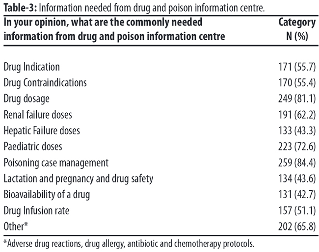 The most common pieces of information the physicians needed from a DPIC related to poisoning case management 259(84.4%), followed by routine dosage of drugs 249(81.1%) and paediatric doses of drugs 223(72.6%) (Table-3).