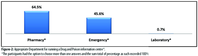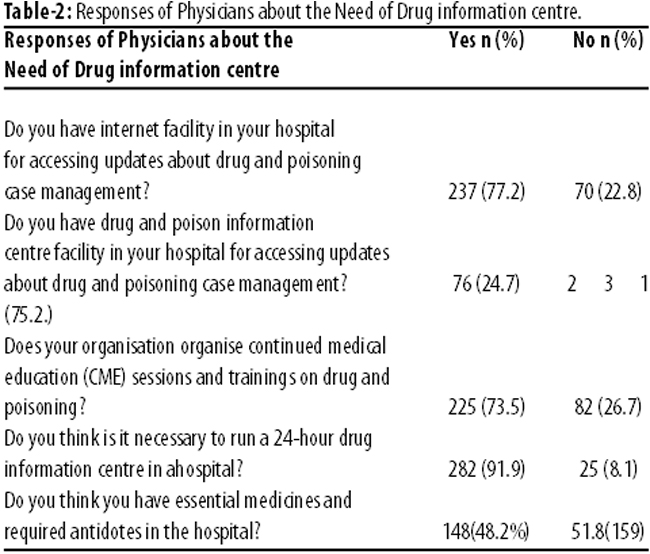Results: Of the 307 physicians, 282(92%) highlighted the need for a 24/7 drug and poison information centre and 206(67%) suggested opening a drug information centre at the hospital. Besides, 215(70%) respondents said they took at least 15 minutes for searching information about the drug while managing a case. Regarding the poisoning case management, 160(52%) physicians complained about the unavailability of medicines in hospitals.