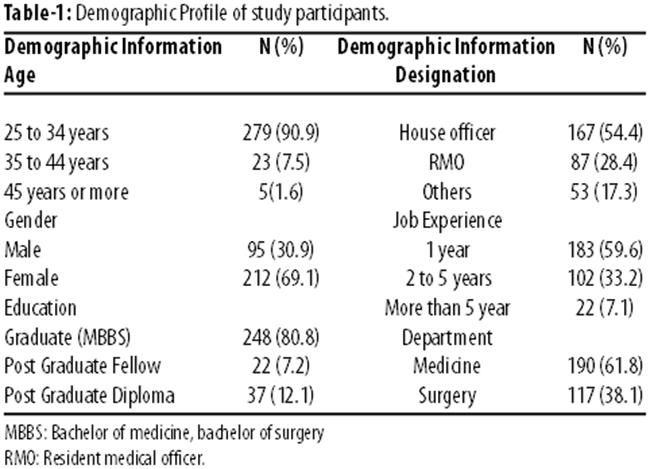 Of the 382 questionnaires distributed, 307(80.4%) were a returned duly filled. Of those 307 respondents, 212(70%) were females and 95(31%) were males. Most of them 279(91%) were aged between 25 and 34 years, while 248(81%) had basic medical graduate degree. Only 22(7%) had specialised medical education (clinical residency and fellowship). Also, 183(60%) responses were received from entry-level physicians with one-year experience (Table-1).