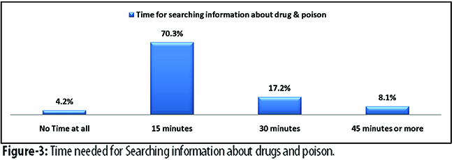 As many as 216(70.3%) physicians took around 15 minutes and 53(17.2%) took 30 minutes for searching the information related to any drug or poison (Figure-3).