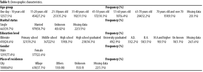 Of the 1668 people dead, 1291(77.4%) were male and 377(22.6%) were female. The highest rate related to the age group 21-30 with 454(27%) killed. As for education level, the highest rate of mortality was 410(24.5%) for illiterate people and the least was 9(0.5%) for those having Master’s degree or higher (Table-1).