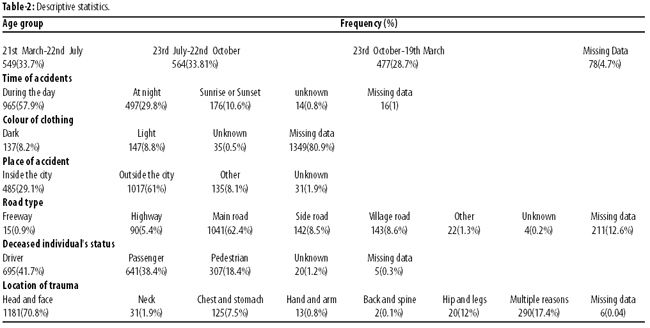 Methods: The retrospective cross-sectional study was conducted in the Fars province of Iran and comprised data of all people having died in road traffic accidents from March 21, 2011, to March 19, 2012. Using census method, all files related to deaths in road accidents were reviewed at the Legal Medicine Centre. Data was analysed using SPSS20.