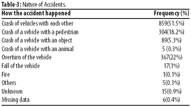 In terms of time of year, the highest rate of mortality was 167(10%) between August 23 and September 22, while the least was 82(5%) between July 23 and August 22. Besides, 965(58%) people died in RTAs during the day, while 497(30%) died at night (Table-2).