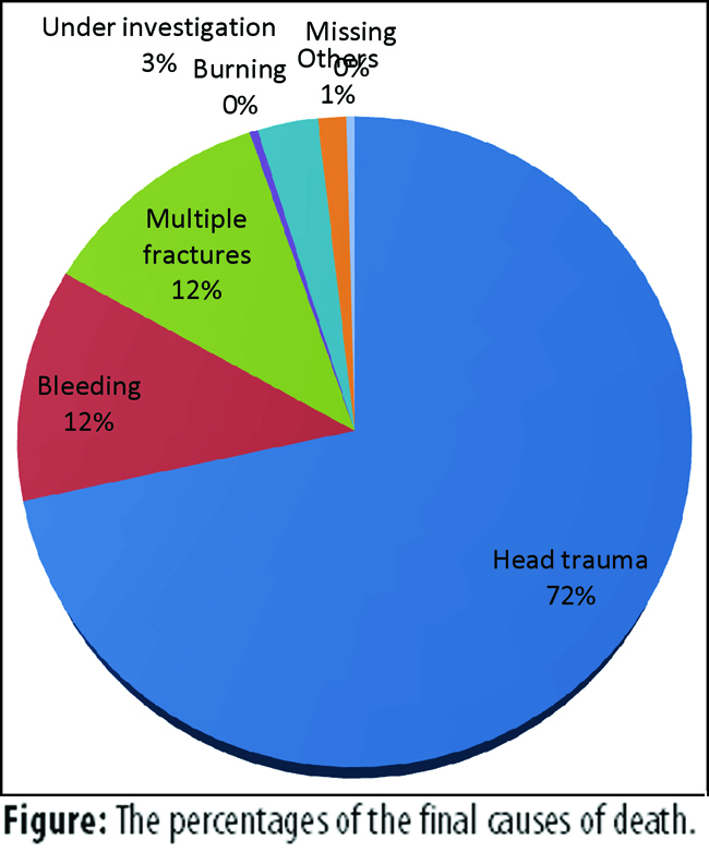 Head trauma was the major cause of death in 1191(71.4%) cases (Figure)