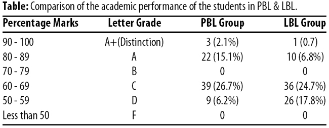 Further comparison showed that 3(2.1%) students of PBL and 1(0.7%) of LBL scored between 90-100% marks; 22(15.1%) of PBL and 10(6.8%) of LBL between 80-89% marks, while none of them scored between 70-79%. Besides, 39 (26.7%) of PBL and 36 (24.7%) of LBL group - fell into 60-69%, while range. Nine (6.2%) students of PBL and 26 (17.8%) of the LBL group were scored in the range of 50-59% marks. No student was found below 50% marks (Table)