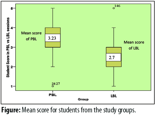 The mean score of PBL group was 3.2±0.8, while it was 2.7±0.8 for the LBL group (p=0.0001) (Figure)