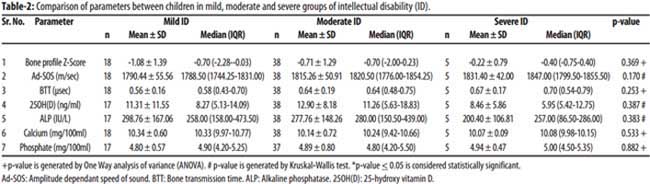 Data was analysed using SPSS 20. For the purpose of analysis, children were further sub-grouped according to ID grades i.e. Mild ID (IQ 50 to 70), Moderate ID (IQ 35 to 50) and Severe ID (IQ 20 to 35). If the Z-Score generated by QUS was less than -2, children were classified as having below-normal bone profile. In case of normally distributed quantitative variables, mean ± standard deviation (SD), independent sample t-test, one-way analysis of variance (ANOVA) and Pearson correlation (r) were used for analysis. Non-parametric statistics i.e. Median (interquartile range [IQR]), Mann-Whitney U test, Kruskal Wallis test and Spearman\\\'s rho correlation (rho) were used for non-normally distributed quantitative variables. P < 0.05 was considered statistically significant for all purposes.