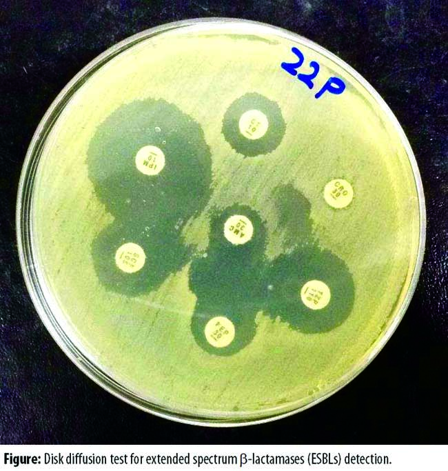 . It was marked by increase in zone of inhibition between Augmentin (AMC) and cephalosporin discs (Figure). Moreover, ESBL production in E. coli was detected to be 81%, whereas 100% amongst Klebsiella pneumoniae. Carbapenem resistance was observed to be 15% (Table-2)
