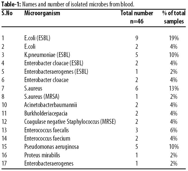 Of the 1400 blood samples screened, only 46 samples (3.3%) had clinically important pathogens indicating septicaemia. Of these 46 microbes, 17 samples (37%) were Extended Spectrum beta-lactamase (ESBL) positive pathogens (Table-1)