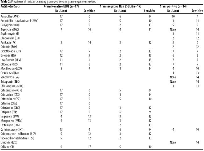 . Prevalence of resistance of pathogens to various antibiotic discs is described in Table-2.