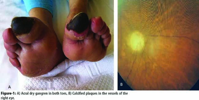 Bryant and White defined calciphylaxis (calcific uraemic arteriopathy) for the first time in 1898.1 Calciphylaxis is a rare clinical picture characterized with arterial calcification and progressive peripheral ischaemic necrosis2 generally seen in chronic haemodialysis patients.1 Etiopathogenesis of calciphylaxis has not been clarified yet.3 It is more frequently seen in females, caucasians and in those obese or diabetic patients with liver disease, using systemic corticosteroids or with high levels of serum calcium phosphate products. 1,3,4 Here, we report a case with calciphylaxis very rarely presenting with bilateral optic neuropathy, acral gangrene and visceral ischaemia.