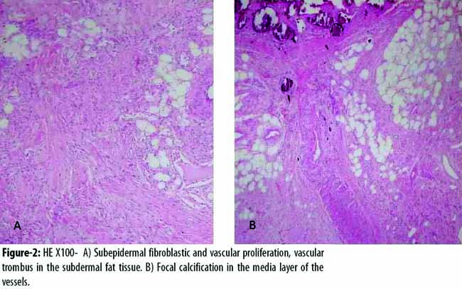 Skin biopsy was performed with the pre-diagnosis of calciphylaxis. However, although calcified areas were suspected in the pathologic examination, it was not diagnostic to evaluate the vascular structures clearly since the sample was not enough.