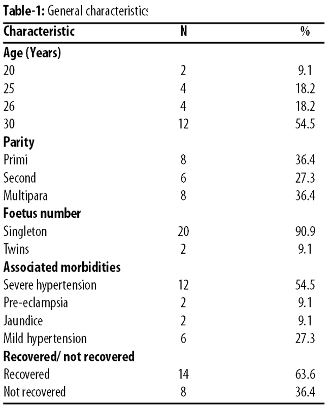 Out of 5742 deliveries, 22(0.38%) were cases of PPCM; the frequency being 3.8/1000 births. Age, parity and medical condition was noted for each patient (Table-1)