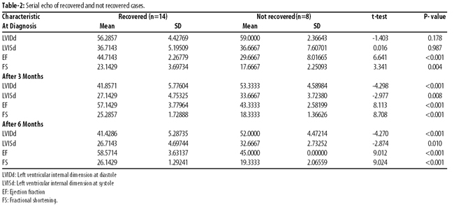 Using echocardiography status at 3rd and 6th month follow-up, findings comparing recovered and non-recovered cases were compared (Tables-2 and 3)