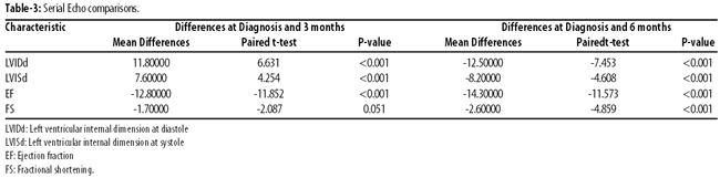 Conclusion: Baseline and follow-up echo was the best tool for prognosis. Baseline left ventricular ejection fraction and fractional shortening were significant predictors of clinical outcome.