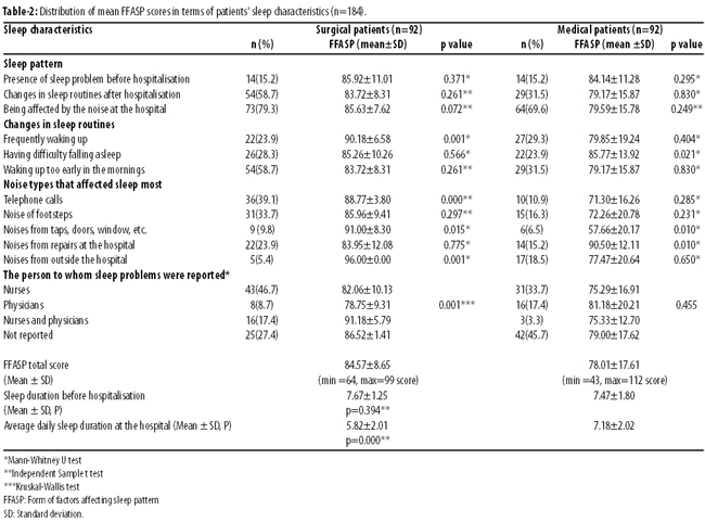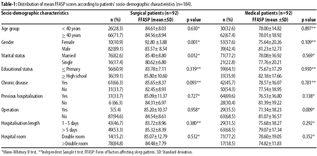 Results: Of the 184 participants, there were 92(50%) each from the surgery and medical clinics. The mean score for the Form of Factors Affecting Sleep Pattern was 84.57±8.65 among the surgical patients and 78.01±17.61 among the medical patients. It was found that noise at the hospital affected sleep patterns among 73(79.3%) of the surgical patients and among 64(69.6%) of the medical patients. There were statistically significant differences between mean scores of the surgical patients and gender and marital status (p=0.001 and p=0.012, respectively), whereas among the medical patients statistically significant differences existed between mean scores and having operation (p=0.09).