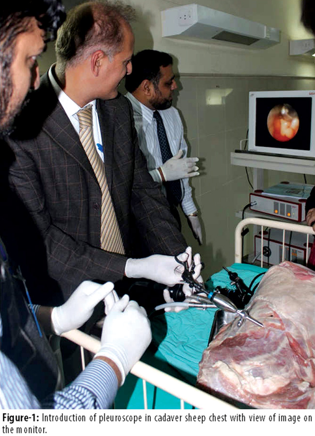 Pleuroscopy (medical thoracoscopy/pleural endoscopy) involves passage of an endoscope through the chest wall that offers the respiratory physician a "window" for direct visualisation and collection of samples from the abnormal pleura.1 It is a valuable diagnostic procedure and, in some cases of pleural diseases, can also provide an opportunity for treatment.2 It is emerging as a new diagnostic modality in Pakistan, but currently its availability is limited to only a few centres in the country due to poor awareness, cost constraints and limited training opportunities.1,3 Pleuroscopy training can be pursued by doing pleural procedures on patients under close supervision by expert trainers as well as using simulated models.2 Evidence is increasing that simulation is an effective means of teaching interventional procedures like bronchoscopy and pleuroscopy using mannequins and animal models.3 Simulation training using animal models enhances education, safety and skills of novices and also reduces chances for complications in patients due to repeatability of procedure.4