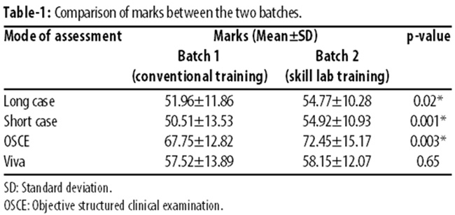 Methods: The cross-sectional comparative study was conducted at Army Medical College, Rawalpindi from February to April 2015. Two batches of final year MBBS were recruited for the study. Batch 1 received conventional training, and Batch 2 received skill lab training. The performance of students was assessed by comparing the marks obtained in long case, short case, objective structured clinical examination and viva. Data was analysed using SPSS 23.