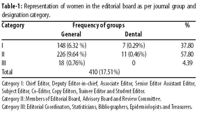 In the journals belonging to the general group, women representation was 392 (18.57%), while in the dental group it was 18 (7.75%). The representation of women in the editorial board as per journal group and designation were worked out (Table-1).