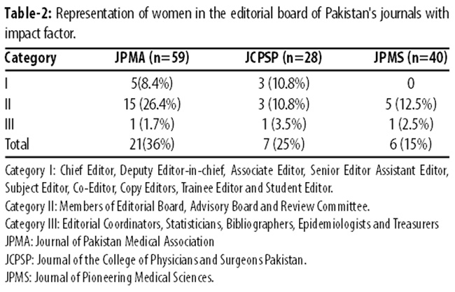 The representation of women on the editorial board of Pakistani journals with impact factor was noted separately (Table-2).
