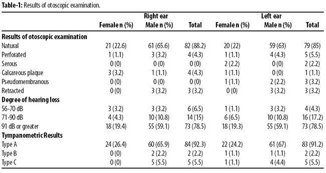 The 95 children in the study group included 70 males and 25 females with a mean age of 11.5±2.4 years. Otoscopic examination was performed in 93 children, pure-tone audiometry in 93, and tympanometry was performed in 91 children, that were compatible for the examination (Table-1).