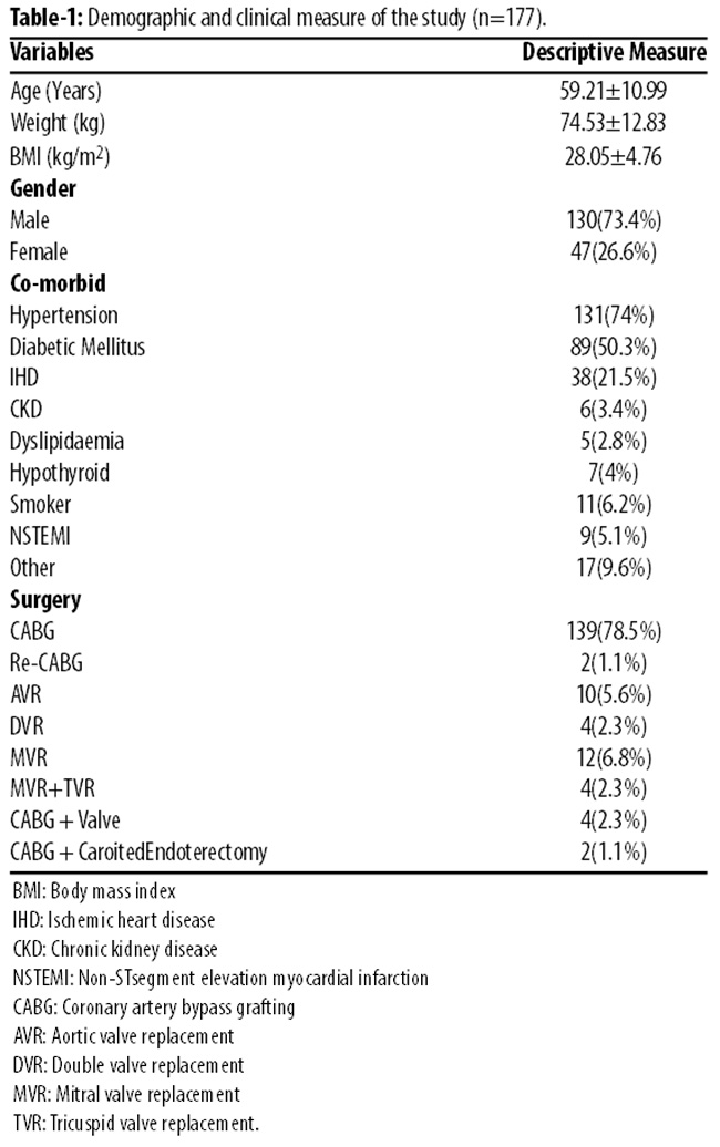 Of the 177 patients, 130(73.4%) were males and 47(26.6%) were females. The overall mean age was 59.21±10.99 years. Hypertension 131(74%) and diabetes mellitus 89(50.3%) were the most common comorbids among participants. Type of surgeries included CABG 139(78.5%), mitral valve replacement (MVR) 12(6.8%), aortic valve replacement (AVR) 10(5.6%) and miscellaneous surgeries that required CPB (Table-1).