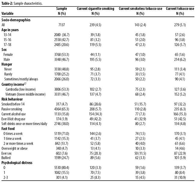 Results: The study comprised 7,137 schoolchildren. The overall mean age was 15.5±1.4 years. Besides, 3,806(53.33%) were from Cambodia and 3,331(46.67%) from Vietnam. Overall, 279(5.1%) students reported currently using tobacco (smoking and/or smokeless), including 214(6.2%) boys and 65(1.6%) girls, and 127(3.6%) in Cambodia and 152(5.2%) in Vietnam. Current cigarette smoking was 239(4.5%) and smokeless tobacco use was 143(2.4%).