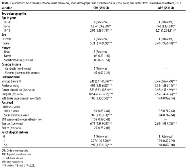 In univariate analysis, socio-demographic factors (older age: crude prevalence ratio [CPR] = 2.96, 95% confidence interval (CI) =1.63-5.39 and being male: CPR=5.21, 95% CI=2.94-9.23) and risk behaviour (smoked before the age of 14 years: CPR=8.48, 95% CI=6.11-11.78, exposure to passive smoking in the past 7 days: CPR=4.02, 95% CI=2.38-6.80, current alcohol use: CPR=7.83, 95% CI=5.83-10.52, ever illicit drug use: CPR: 10.54, 95% CI=6.59-16.85, having had once or more daily soft drinks: CPR: 1.80, 95% CI=1.30-2.50, having had twice or more times a week fast food: CPR: 2.05, 95% CI=1.35-3.11, ever had sex: CPR=6.72, 95% CI=4.88-9.26, and psychological distress: CPR: 3.70, 95% CI=1.70-5.19) were found to be associated with current tobacco use.