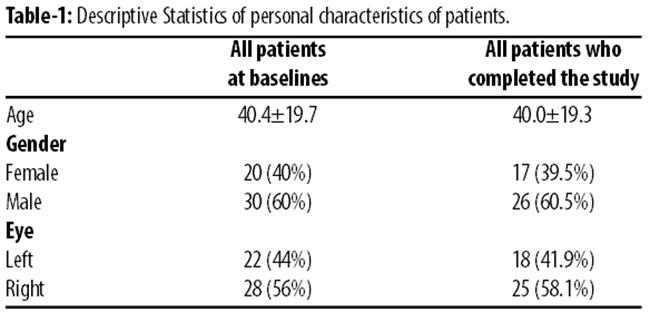 Of the 50 patients, 30(60%) were male and 20(40%) were female. Follow-up record was available for 43(86%) patients and 7(14%) were lost to follow up, including 3(42.9%) females and 4(57.1%) males. The overall mean age was 40±19.3 years (range: 9 months to 80 years). There were 14(28%) cases of impending perforation. Primary and recurrent pterygium were found in 9(18%) and 8(16%) patients, respectively. There were 7(14%) patients of infected corneal ulcer and 9(18%) had perforated corneal ulcers. Also, 1(2%) had keratomalacia, 1(2%) patient requiring grafting had Bowen\\\'s disease and in 1(2%) patient there was exposed lateral rectus.