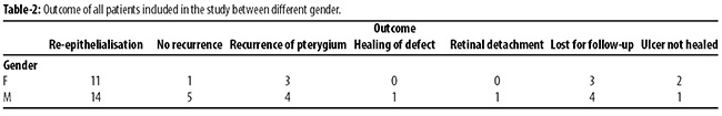 Healing of defect occurred in males and also retinal detachment. Ulcer was not healed in 2(4%) females and 1(2%) male. The frequency of re-epithelialisation was more among males. Recurrence of pterygium was more in females.