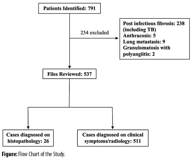 This retrospective, observational study was conducted at the Aga Khan University Hospital (AKUH), Karachi, and comprised records of patients diagnosed with ILD from January 2005 till December 2015. The AKUH is a tertiary care hospital with a total of 640 beds.All adult patients with suspected ILD on the basis of clinical history and radiological features on high-resolution computed tomography (HRCT) scan of the chest were reviewed by a multidisciplinary team consisting of a senior pulmonologist and radiologist with expertise in diagnosis of ILD. The files were retrieved using International Classification of Diseases-9 (ICD-9) coding. The definite diagnosis of ILD was based on histopathology if available. Other cases were labelled as ILD on the basis of clinical and HRCT findings. Patients with post-infectious fibrosis or bronchiectasis were excluded (Figure).