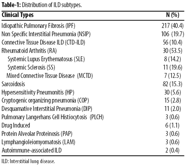 Conclusion: Idiopathic pulmonary fibrosis was found to be the most common interstitial lung disease subtype followed by non-specific interstitial pneumonia, sarcoidosis and connective tissue disease-related-interstitial lung disease.