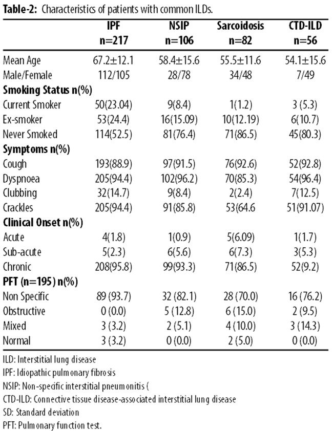 Results: Of the 537 patients, 324(60.3%) of the participants were females. The overall mean age was 60.5±14.9 years. The most common co-morbid condition was diabetes mellitus in 72(13.4%) patients, followed by hypertension in 48(8.9%) and ischaemic heart disease in 21(3.9%). The most common interstitial lung disease was idiopathic pulmonary fibrosis in 217(40.4%) patients, followed by non-specific interstitial pneumonia in 106(19.7%), sarcoidosis in 82(15.3%) and connective tissue disease-related interstitial lung disease in 56(10.4%) patients.