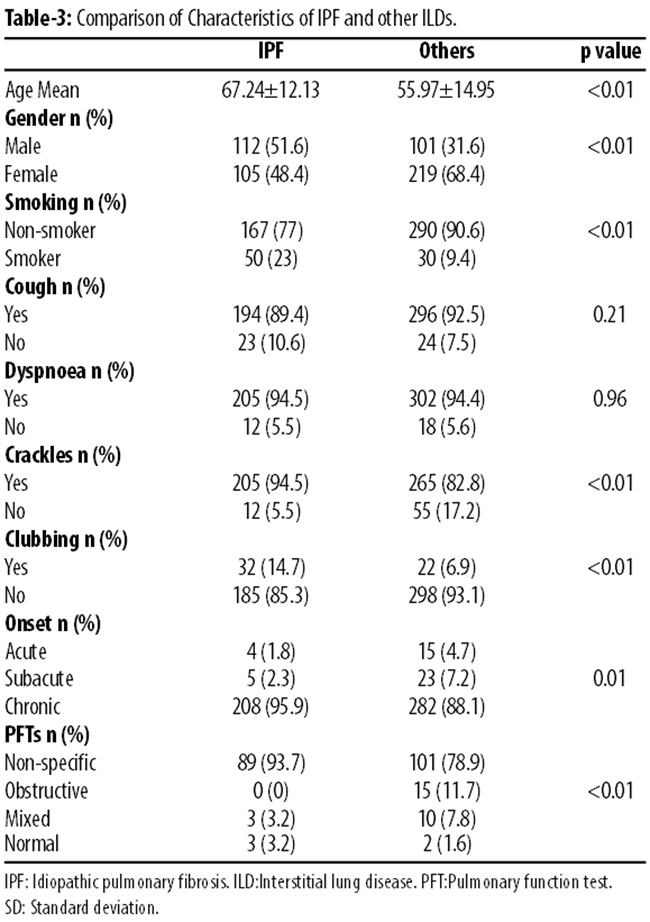 As IPF was the most common pattern in our study, we also compared the characteristics of IPF with other types of ILD (Table-3).