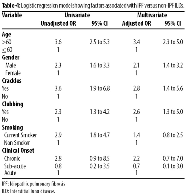 On logistic regression analysis, age greater than 60 years (odds ratio [OR] 3.4; 95% confidence interval [CI] 2.3 to 5.0) and male gender (OR 2.1; 95% CI 1.4 to 3.2) were significantly associated with IPF as compared to non-IPF ILDs when adjusted for smoking status and clinical onset of disease (Table-4).